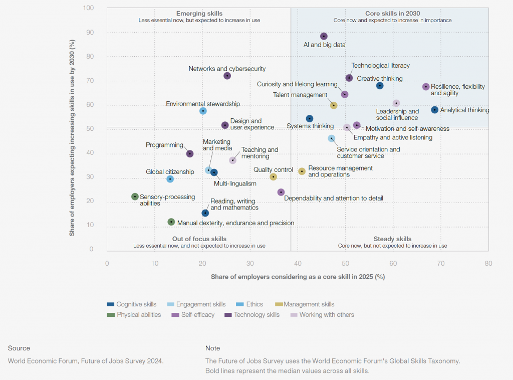 Wie der Future of Skills Report 2025 bestätigt, steigt nicht nur die Relevanz von Kernkompetenzen wie AI und Big Data, sondern auch die Fähigkeit, Empathie zu zeigen, aktiv zuzuhören und auf die Bedürfnisse von Kundschaft und Zielgruppe einzugehen. Außerdem bleiben analytisches Denken, Agilität und Führungskompetenzen auf einem relevanten Niveau.